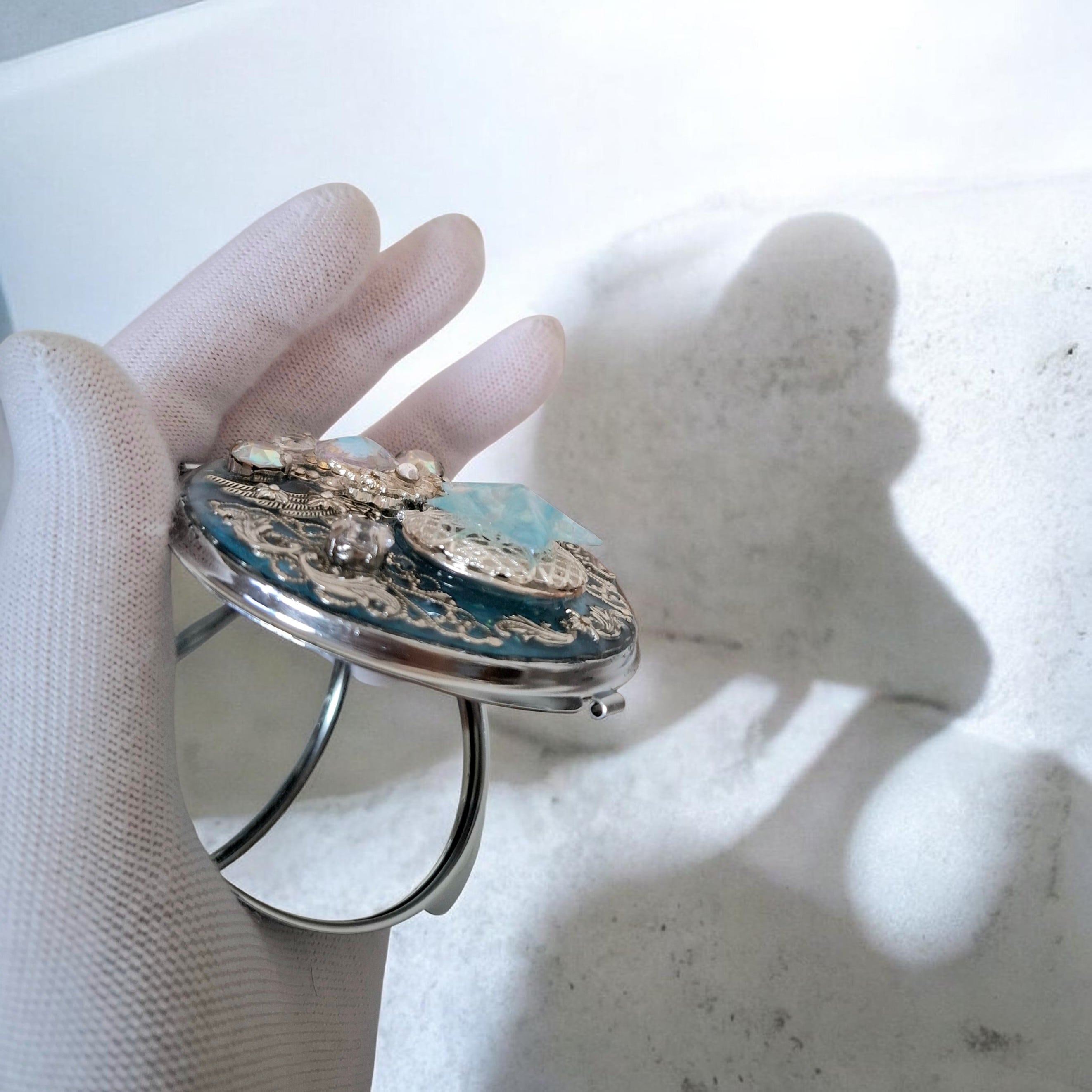 このミラーは、幻想的なアイスブルーの光を放ち、持つ人を優雅で特別な気分にさせます。中央にある星にマグネットを近づけると、アイスブルーの光が点灯し、点滅をします。